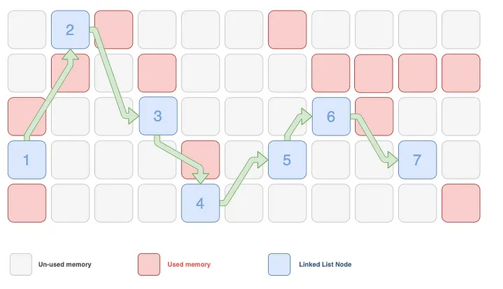 - 연결리스트는 각 데이터가 퍼져있습니다. 즉, 포인터를 사용하여 각 영역을 참조합니다.