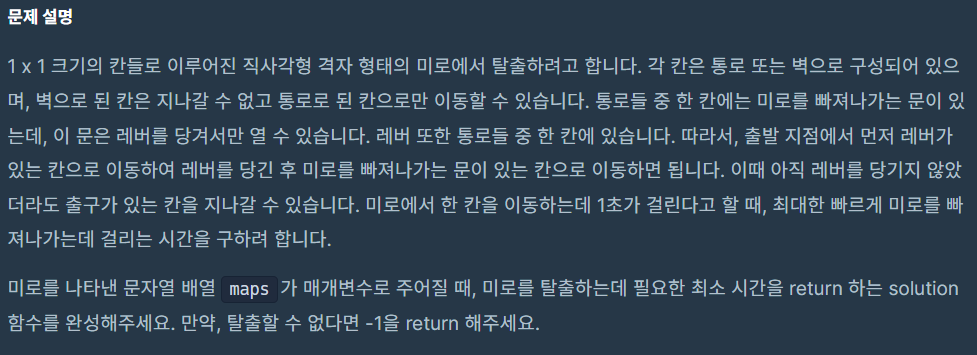 - BFS를 구현하고 각각 시작지점과 레버, 레버와 출구의 좌표를 넣어 거리를 구한 후 더하여 결과값을 리턴해주었습니다.