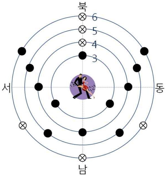 위 그림은 D1 = 3, D2 = 6일 때, 배치된 좌석 및 좌석의 사용 여부를 나타낸다. 숫자는 원의 반지름을 나타내고, ●은 공연에 사용되는 좌석, ⊗은 공연에 사용되지 않는 좌석을 나타낸다.